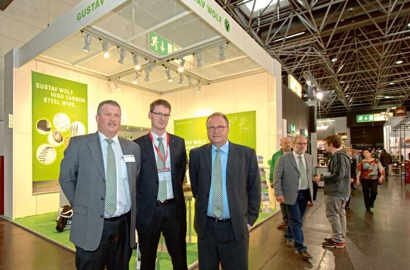 Der kleine, aber feine Stand von Gustav Wolf war über alle Tage stark frequentiert. Fast pausenlos führten Daniel Wolf, Ralf Krone (Technischer Leiter Draht) und Holger Kruse (Verkauf Draht), Gespräche mit Kunden und Lieferanten. Die Besucher waren auch durch ein gezieltes Mailing und durch Anzeigen in der Fach- presse auf die Präsenz von Gustav Wolf auf dieser bedeutenden Messe für die Drahtbranche aufmerksam gemacht worden und nahmen das Angebot gerne an.